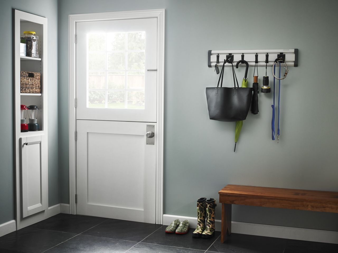 Twee veelzijdige lepelhaken op het multifunctionele GearTrack®-pakket voor zwaardere items als rugzakken en skateboards. En 4 J-haken voor jassen en dergelijke.